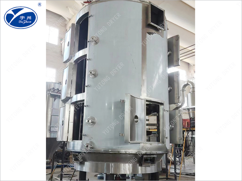 The wet material self-feeder is continuously added to the first layer disc of the drying equipment, and the rake arm with the rake blade makes a rotating motion, so that the rake blade continuously turns over the material, and the material flows through the surface of the drying disc along the exponential helix, and the material on the low drying disc moves to the outer edge, and falls to the outer edge of the high drying disc below. The material on the high drying tray moves inward and falls from the middle to the next layer of low drying tray, and the high and low drying tray is arranged alternately up and down, so that the material can continuously flow through the entire drying equipment. The heating medium is fed into the hollow drying tray, and the heating medium enters from one end to the other end, and the dried material falls from the last layer of drying tray to the bottom of the shell. Finally, it is moved to the feed port by the rake blade. The steam evaporates out through the wet outlet set on the top, and the solvent is recovered by the condenser and then discharged out through the vacuum pump. The dry material flowing from the bottom is cooled and packaged directly.