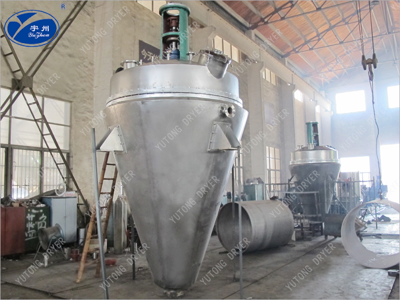 The main body of the equipment is upright and stationary, and the heated spiral belt carries out circular stirring and lifting movement. After the material enters the dry chamber, the jacket and the stirred spiral belt are used to contact and heat the material. The material is stirred by the spiral belt in an orderly manner, which turns over, lifts and falls, so that the material constantly contacts the wall of the heating chamber and carries out forced heat exchange. To achieve the purpose of rapid drying.
