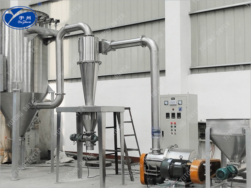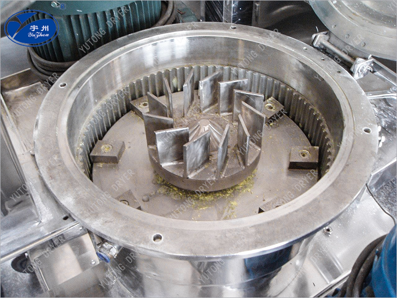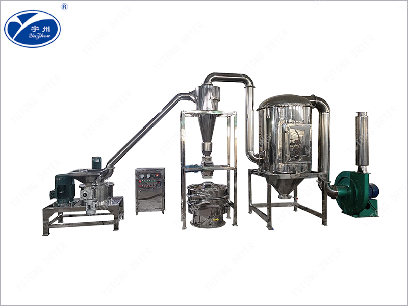 The material enters the crushing chamber through a hopper and a screw conveyor. The crushed material is sheared by high-speed blades to obtain pulverization. The material is then transported into a cyclone separator, bag filter, and discharged to meet the requirements of the product through negative pressure air transportation.
