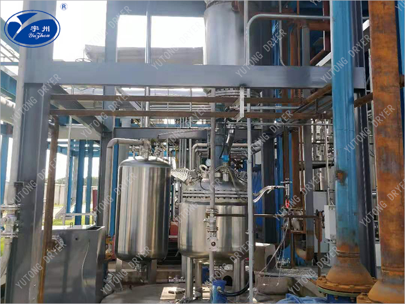The material enters the evaporator radially from above the heating zone, and is distributed to the heating wall of the evaporator through the distributor. Then, the rotating scraper continuously and uniformly scrapes the material into a thin and uniform liquid film on the heating surface, and pushes it downwards in a spiral shape. During this process, the rotating scraper ensures continuous and uniform liquid film to generate high-speed turbulence, and prevents the liquid film from coking and scaling on the heating surface, thereby improving the total transfer coefficient. Light components are evaporated to form a steam stream that rises and passes through a vapor-liquid separator to reach an external condenser directly connected to the evaporator. Heavy components are discharged from the cone at the bottom of the evaporator.