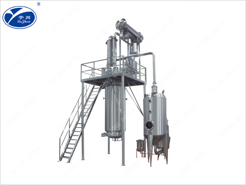 The secondary steam continues to rise and condenses into a hot condensate through the condenser. It then falls back into the extraction tank and is added as a new solvent onto the medicinal surface. The new solvent passes through the medicinal layer from top to bottom and reaches the bottom of the extraction tank. The soluble active ingredients in the medicinal materials dissolve in the solvent. The extraction solution is drawn into the concentrator through a filtration tube, and the secondary steam generated by concentration is sent to the extraction tank as a heat source and new solvent. This forms a large reflux cycle for extraction of the new solvent. Therefore, the solute density in the medicinal material maintains a high gradient with the solute density in the solvent, and the solutes in the medicinal material are dissolved at high speed. After extraction, the extraction solution is completely drawn into the concentrator, and the concentrated secondary steam is transferred to the cooler. The concentration continues until the ointment with the required specific gravity (1.2-1.34) is concentrated and released for later use. Extract the residual liquid from the tank and put it into the storage tank for reuse in the next batch. The drug residue is discharged from the slag gate. If organic solvent is used for extraction, add an appropriate amount of water first, open the straight pipe and jacket steam, recover the solvent, and then discharge the residue.