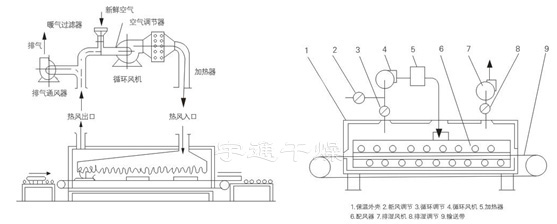 During operation, hot air is sprayed simultaneously from top to bottom onto the material on the conveyor belt through a jet stream. Due to the jet velocity of over 15m/s, the convective heat transfer film is extremely thin, the heat transfer coefficient is high, and the drying speed is fast. When this equipment is used with impermeable materials, the top jet airflow still returns to the top, and the bottom jet airflow still returns to the bottom, participating in the circulation. The airflow beam of breathable materials has strong penetration and diffusion inside the material. The use of heat sources can include steam, electricity, hot air stoves, and fuel flue gas.