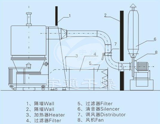 空氣在高壓離心通風(fēng)機(jī)的作用下,經(jīng)過(guò)空氣過(guò)濾器過(guò)濾,進(jìn)入空氣熱交換器加熱至設(shè)定溫度,然后通過(guò)氣體分布板形成無(wú)數(shù)高速氣流束沖擊物料,氣束間所形成的負(fù)壓作用物料,使之成為沸騰狀。此狀態(tài)下熱空氣與物料廣泛地接觸,增強(qiáng)了傳熱過(guò)程,因而在較短的時(shí)間內(nèi)促使物料中的水份蒸發(fā)、分離。濕氣流透過(guò)捕集袋由風(fēng)機(jī)排出,被捕集袋截留在沸騰器內(nèi)的物料則為干燥產(chǎn)品。