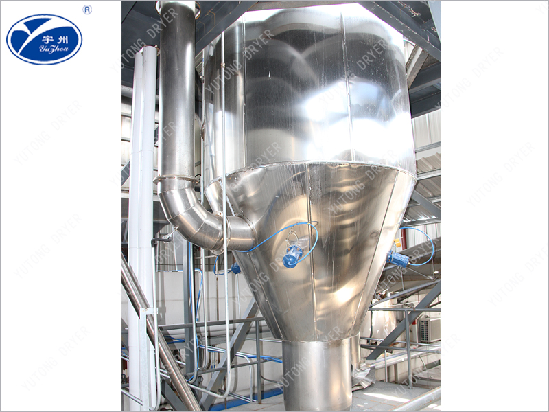 Воздух поступает в нагреватель через фильтр, обменивается на горячий воздух, поступает в распределитель горячего воздуха в верхней части сушилки, так что воздух равномерно вращается или параллельно оси поступает в сушилку. Материальная жидкость должна быть просеяна, а затем перекачивается насосом высокого давления в сопло, расположенное в центре сушильной камеры. Жидкость равномерно распыляется, что значительно увеличивает площадь поверхности капли. При контакте с горячим воздухом вода быстро испаряется и высыхает в гранулированные продукты за очень короткий промежуток времени. Большая часть продукции собирается в выхлопных отверстиях на дне башни, а выхлопные газы и мелкие частицы порошка отделяются от циклонных сепараторов. Готовая продукция собирается из коллектора в нижней части циклонного сепаратора, а выхлопные газы выделяются из выхлопных вентиляторов.